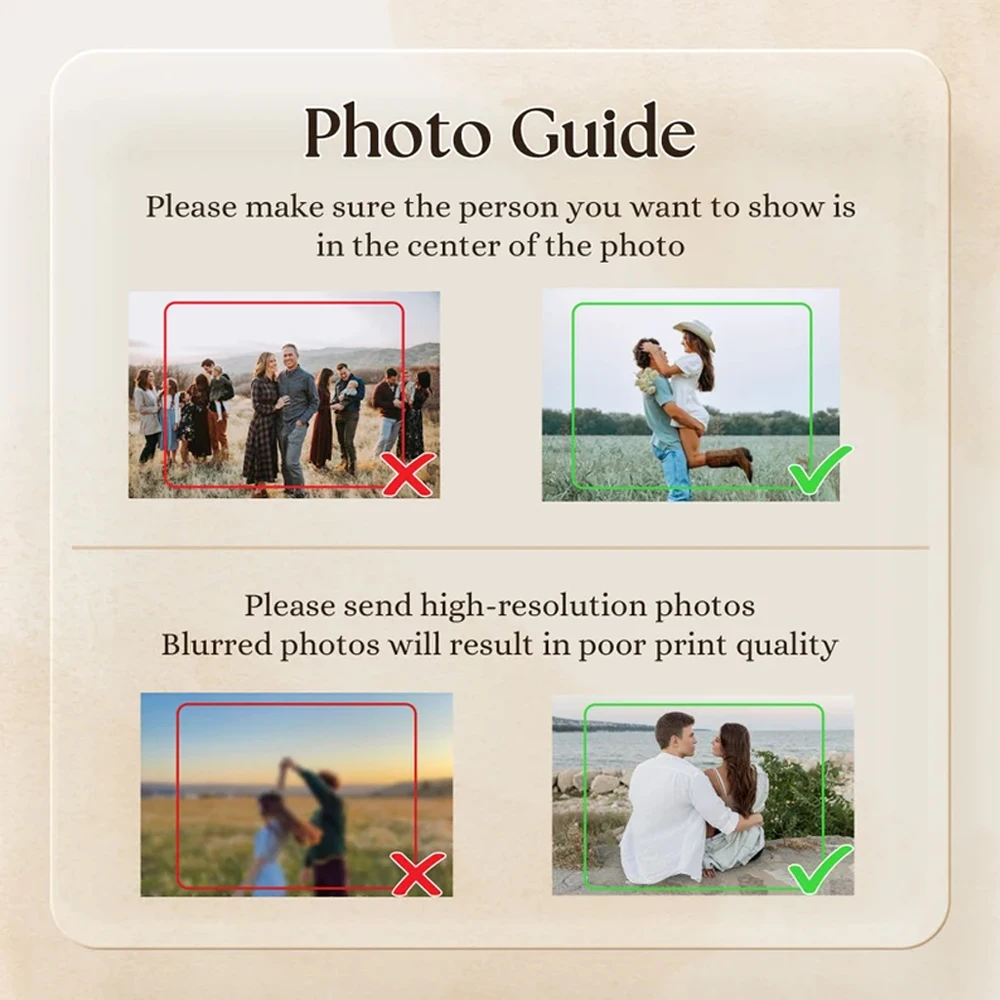 ① Prosimy o natychmiastowe przesłanie spersonalizowanego zdjęcia / tekstu / imienia / daty / piosenki / wykonawcy do naszej obsługi klienta zaraz po złożeniu zamówienia.